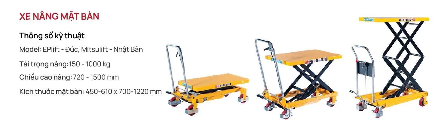 Bàn nâng thủy lực: Nâng vật nặng đến độ cao mong muốn, dùng trong lắp ráp, bốc dỡ hàng.