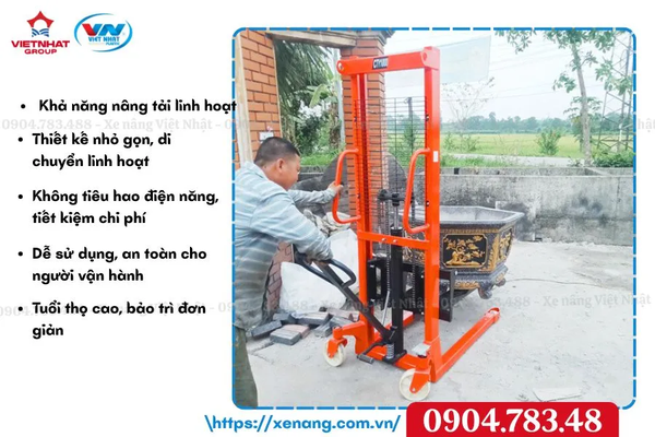 Khác với xe nâng điện hoặc xe nâng động cơ, xe nâng tay cao vận hành bằng sức người, không cần nhiên liệu hay điện năng, nên chi phí đầu tư thấp, bảo dưỡng đơn giản, tuổi thọ cao.