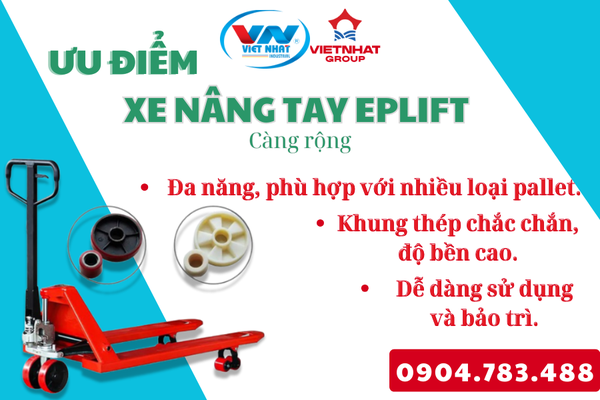 - Mô tả: Xe nâng tay Eplift càng rộng cung cấp khả năng nâng hạ hàng hóa linh hoạt với nhiều loại pallet khác nhau.